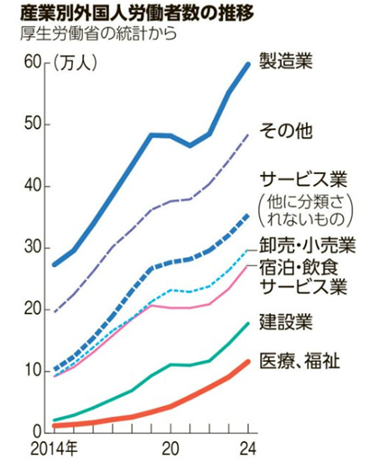 彼らがどこで働いているのか、具体的な業種を見てみると、私たちの生活がいかに彼らに支えられているかがよくわかります。特に注目すべきは、彼らを採用している事業所の約62%が、従業員30人未満の中小企業だということです。大企業だけでなく、地域に根ざした小さなお店や工場こそが、外国人の力なしでは立ち行かなくなっているのが現状です。また、製造業や建設業では「技能実習(あるいは育成就労)」の枠組みの人々が、飲食店では「留学生」が大きな役割を担っています。